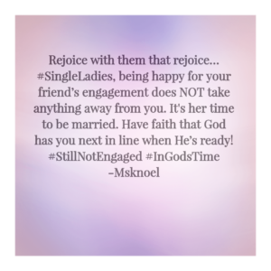 Also, it does not take anything away from you, or make you less of a person to celebrate her engagement with her. It is her time to walk into this season of marriage. God wants us to rejoice with them that rejoice (Romans 12:15). You may not see it now but know by faith that God has you next in line when He’s ready! So be encouraged! Your friend’s engagement does not mean that God has overlooked you. It means that He’s in your neighborhood. What He’s done for her, He’ll do for you! God is no respecter of persons. He gives nothing but the best to His children!